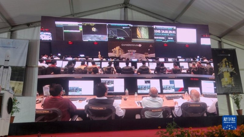 8月23日,在印度班加罗尔,一处大屏幕播放印度月球探测器相关直播画面。(图源:新华社)