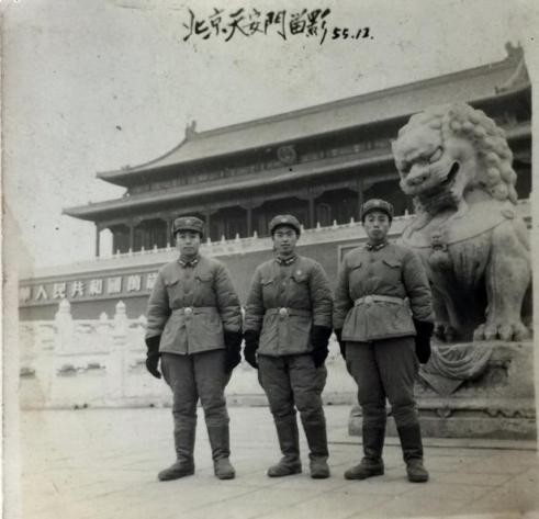 1955年12月三个士兵在天安门留影,佩戴55式领章,穿50式冬服。