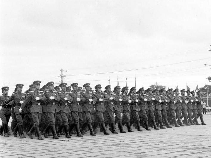 1955年国庆阅兵式上,身着新式军装的坦克学校军官队伍通过天安门广场。