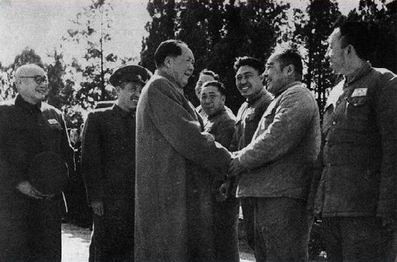 1956年1月,毛主席在南京视察军事学院。刘伯承院长(左一)陪同毛主席接见教职员代表。