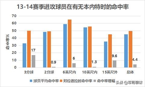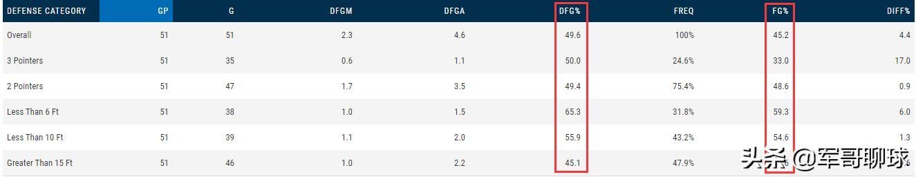 从柱状图显示,进攻球员在面对本内特时命中率都会提高,这是多么痛的领悟啊,本内特简直是一个防守漏洞,甚至三分线外的防守,让对手命中率提高17个百分点。可能这个数据你们看到也会特别惊讶,但是数据不会骗人,这就本内特作为前锋的一种尴尬存在,小前锋的身高,大前锋的技术特点。