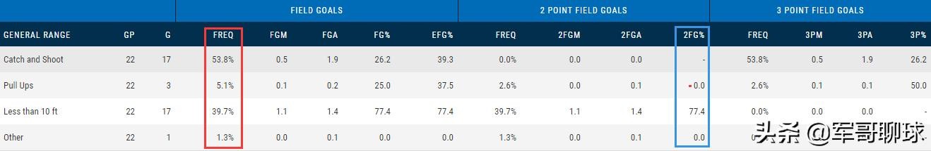 从上图可以看出,他在发展联盟在两分球的选择上,在没有助攻和有助攻的时候出手率差不多达到50%,说明他加强了自己在进攻端的持球进攻,命中率也有所提高;再来看看他在三分球的出手选择上,他更偏向于接到队友助攻后的接球即投,接球即投出手达到了90%以上,也是延续了他在NBA时期在三分球上的出手选择,值得庆幸的是,他提高了自己三分球的命中率,这一切来源于他付出的汗水以及想继续打球的决心。