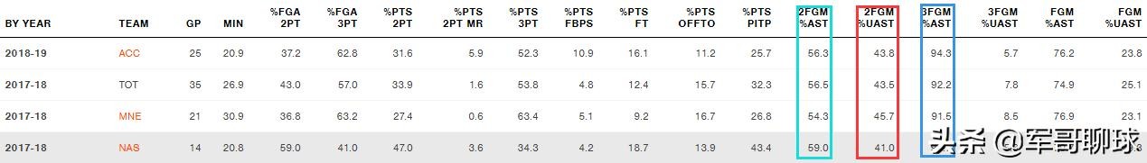 再来看看一项数据,他的投篮命中率有了很大的提升,发展联盟时期投篮命中率最好的时候是在太阳下属发展联盟,达到55.2%,而相对于NBA时期,提升最大的应该是他的三分球命中率,从NBA时期的生涯的26.1%,提升到发展联盟的40%以上,这也使得火箭莫雷后来签下他的重要原因,也进一步丰富了他的进攻手段。