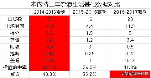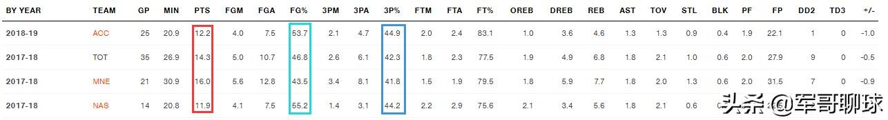 这三年出场不到100场比赛,场均上场时间更是少之甚至,猛龙时期场均场均上场时间只有4.4分钟,命运的悲催,沦为板凳末端的球员。得分就更不用说了,场均5分,猛龙最低1.5分,投篮命中率不足40%,一步步的坠落谷底。