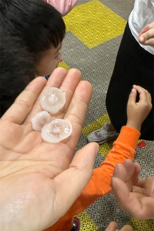 “这是一种少见的天气现象,大家不要惊慌。”位于白云区机场路附近的民航广州幼儿园,不少孩子目睹冰雹跌落地面。在给孩子们上课的老师们,看到孩子们个个好奇地望出窗外,在确保孩子们安全的前提下带大家到屋檐下观看操场的冰雹,并向孩子们科普天气常识。