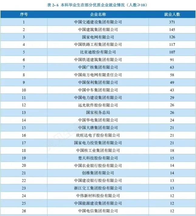 从图表可以看出来,该学校大多去交通、电力的国企。如中国交通建设集团有限公司、中国电网、中铁、南方电网等。可以说长沙理工大学毕业出来的学生就业情况是很不错的。