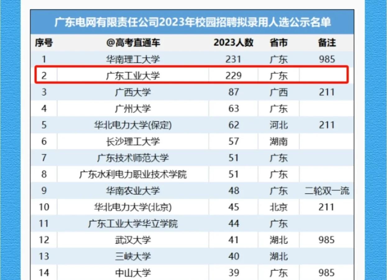 从图中可以看出来,广东工业大学毕业生进入广东电网就业的人数是非常多的,在广东省内仅次于华工。