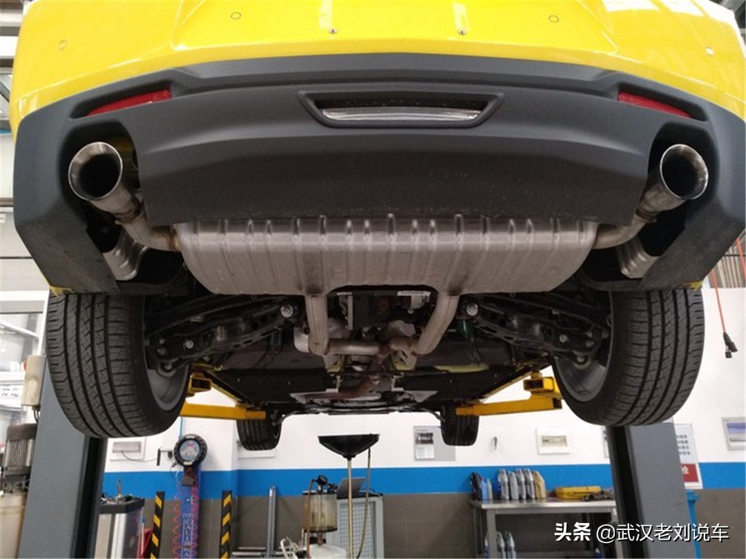 这个角度看的比较清楚,排气管口径挺大的。不过这台科迈罗的性能在跑车里并不算出色,搭载的2.0T四缸涡轮增压发动机跟凯迪拉克ATS上的是一样的,只是调校有点不同。如果按账面数据看,比凯迪拉克ATS还稍微差一点点,最大马力是275匹,而凯迪拉克ATS是279匹,峰值扭矩都是400牛米。但如果跑赛道的话,这台科迈罗还是强于凯迪拉克ATS的,除了调校方面有差异外,制动上也有差别,极限工况下表现更好。科迈罗的变速箱是8AT,驱动形式是后驱,这些跟凯迪拉克ATS也都是一样的,以至于有人说2.0T的科迈罗就是换壳的凯迪拉克ATS。老刘觉得如果不是专业人士来开这两个车,我想也可以这么理解,反正三大件都一样,大部分人也开不出来差别。这台科迈罗0-100km/h加速实测一般是6秒出头,算是入门级跑车水平。