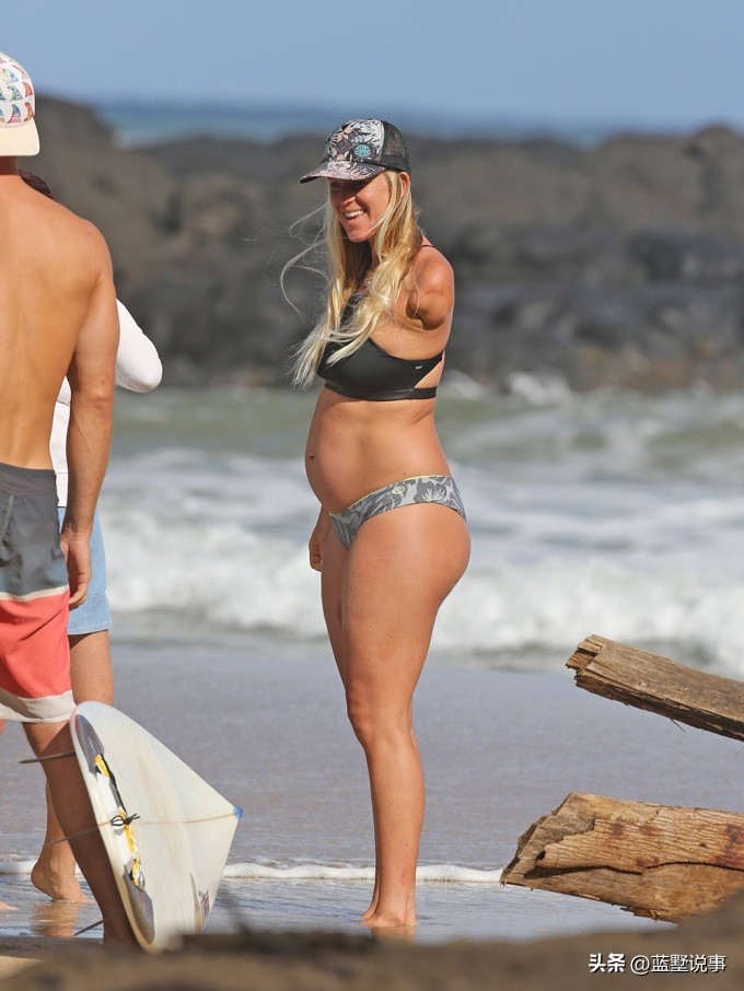 美国独臂冲浪手贝瑟尼·汉密尔顿怀着第二个孩子在海滩上度过了一天。她穿着一件两件套的衣服,展示了她晒得黝黑的孕肚。