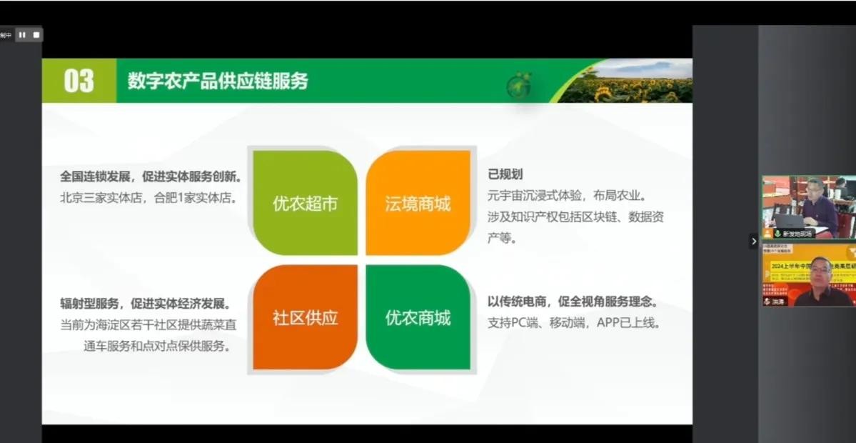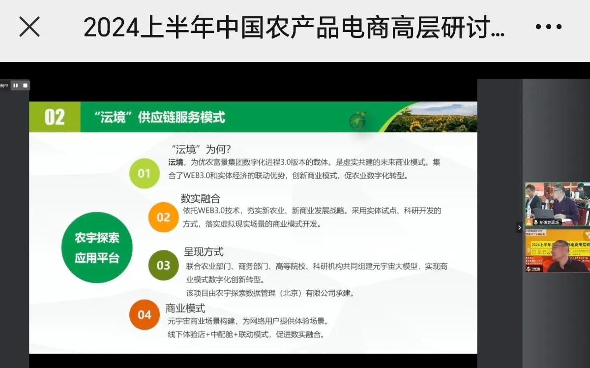 2024年9月12日,“2024上半年中国农产品电商高层研讨会”在北京新发地农产品博览中心举行。研讨会有领导致辞、报告发布、案例分享、专家点评和三言两语五个环节。此次会议采取主会场和分会场、线上线下同步的方式进行。优农富景集团有限公司创始人张研应邀在“三言两语”环节作发言。