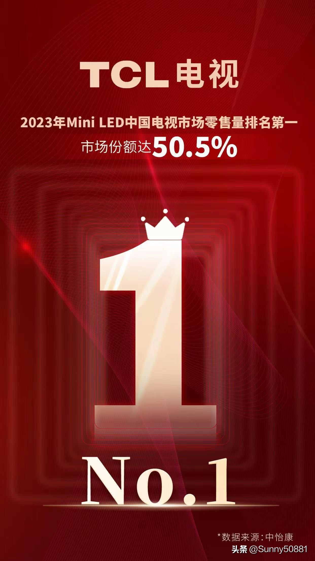 更令人瞩目的是,在Mini LED技术领域,TCL电视更是独领风骚。据中怡康数据显示,TCL在2023年Mini LED电视中国市场零售量排名中以高达50.5%的市占水平稳居第一,同时在98吋电视市场零售量市场份额中也取得了52.3%的市场份额,稳坐行业第一宝座。TCL凭借领先的Mini LED技术,在高端彩电领域一马当先,彰显出其在科技创新方面的不断突破与引领。