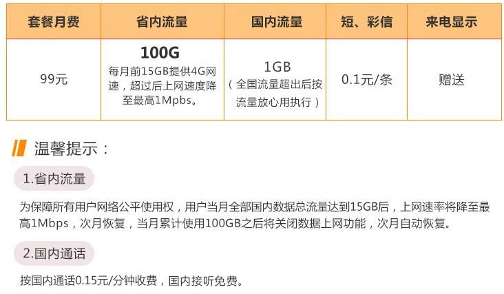 另外,套餐外国内流量,按照0.27元/MB计费,达到10元后,则自动安超10元/100MB计费,超过30元后至1GB前不收费,也即套餐外的国内数据流量按照30元/GB计费。该套餐每月前15GB省内流量提供4G网速,超过后上网速率降低至最高1Mbps,当月累计使用100GB的流量后,则关闭数据上网功能,次月自动恢复。