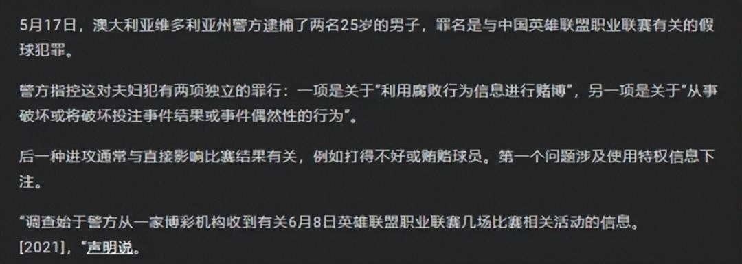 从目前外媒报道的信息来看,澳洲警方以涉嫌参与LPL假赛为罪名,逮捕了两名男子,称他们犯有“将腐败行为信息用于投注”、“从事破坏或者可能破坏事件或意外事件的投注结果的行为”两项罪名,说白了就是跟战队高层沆瀣一气,操控比赛的走向。