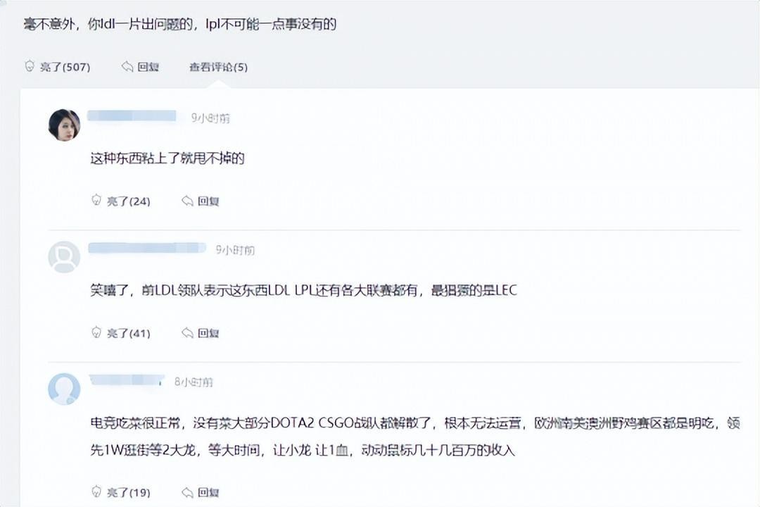 而国内玩家对此的反应,也是出奇地一致:“毫不意外,你ldl一片出问题的,lpl不可能一点事没有的”,“电竞吃菜很正常,没有菜大部分DOTA2 CSGO战队都解散了,根本无法运营,欧洲南美澳洲野鸡赛区都是明吃,领先1W逛街等2大龙,等大时间,让小龙 让1血,动动鼠标几十几百万的收入”……