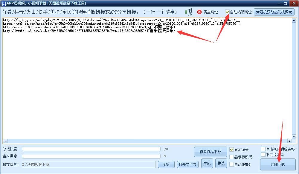 打开天图视频批量下载工具,没有的朋友直接度娘上搜索下载或到官网下载最新版本。然后选择短视频下载,将要刚才复制的连接粘贴到下载框里,然后点击立即下载就能轻松解析到本地!