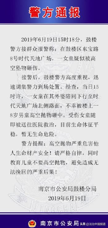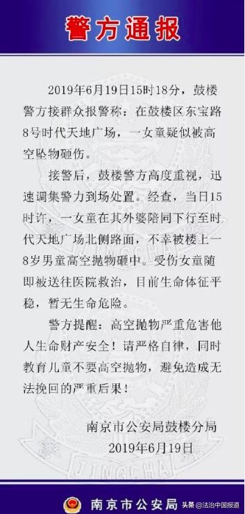 6月20日凌晨1点55分,南京鼓楼警方发出通报称,女童经过时不幸被楼上8岁男童高空抛物砸中。