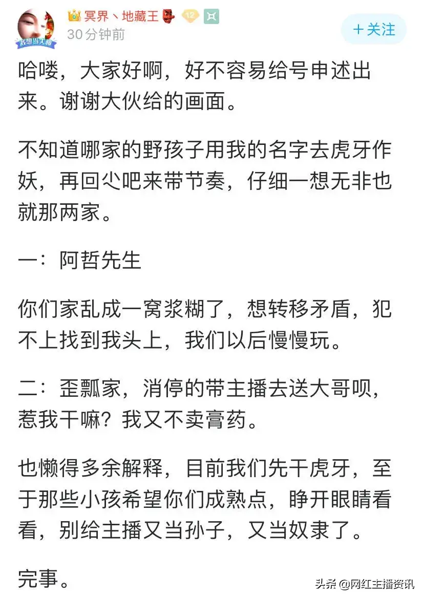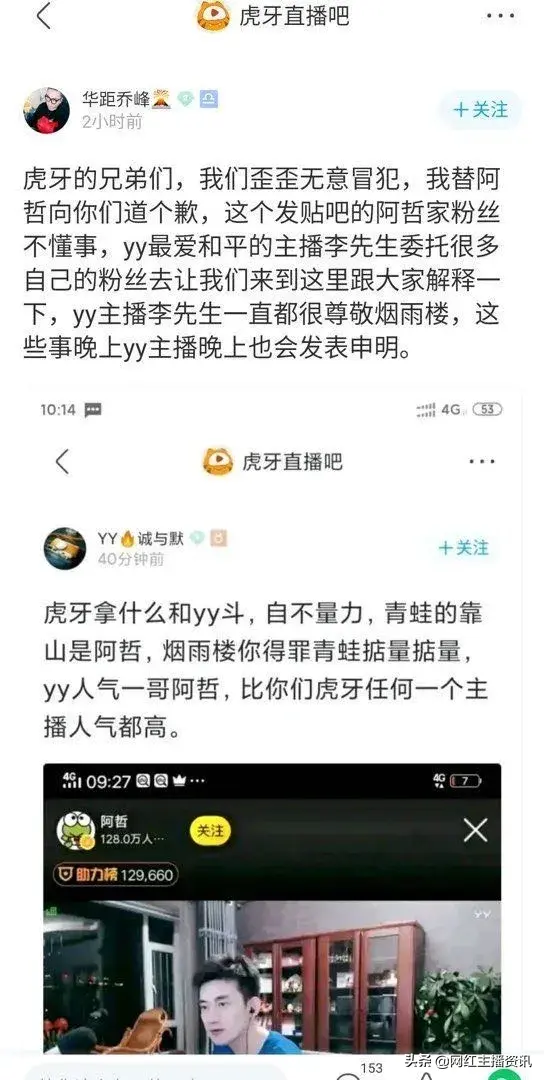 老李家去虎牙道歉的贴吧大神被扒出来之后,直接被YY粉丝屠版狂喷是XX!他接连发贴称不知道哪家的野孩子用我的名字去虎牙作妖,然后回贴吧带节奏,仔细一想无非就是阿哲和毕加索两家!随后指出心悦本来最近就内乱节奏很大,此举是想转移矛盾,犯不上找到李家头上!歪瓢家的消停带主播去送大哥呗,惹我干嘛?还特意去虎牙贴吧开贴向虎牙的粉丝道歉!