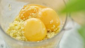 3、将洗净浸泡后的小米控干水分,倒入料理机中,加入蛋黄和玉米油。