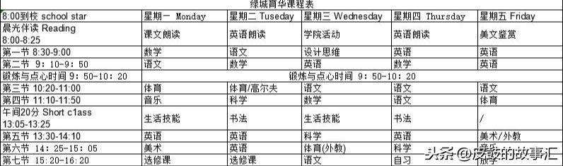 课程模式:基础课程+特色课程,例如绿城育华就在基础的国家课程上增加了一百多门选修课程,例如书法、天文、芭蕾、绘画,轮滑,橄榄球等等。双语班的话每周有 30节课左右,其中有 17节是中文课,13节是外教英文课。而其中英语、科学、都是全英文教学,语文、数学、音乐是全中文教学,体育、计算机、美术是中英交叉教学。