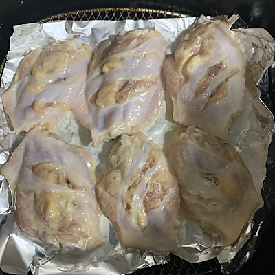 4、打开空气炸锅,180度预热10分钟。预热完铺上锡纸,(可以先刷一遍油)放入鸡翅,180度烤10分钟。然后将鸡翅翻面,同样的温度再烤10分钟。