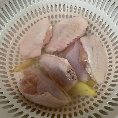 1、鸡翅用清水解冻,放入姜片去腥,浸泡15分钟。