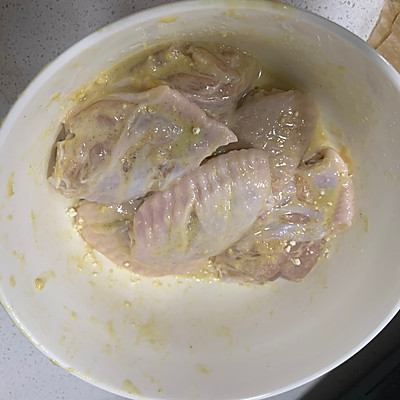 3、将切完口的鸡翅冲洗一遍,用厨房用纸将鸡翅擦干。然后用香蒜炸粉涂抹均匀放入冰箱腌制30分钟以上。(腌久一些更入味)