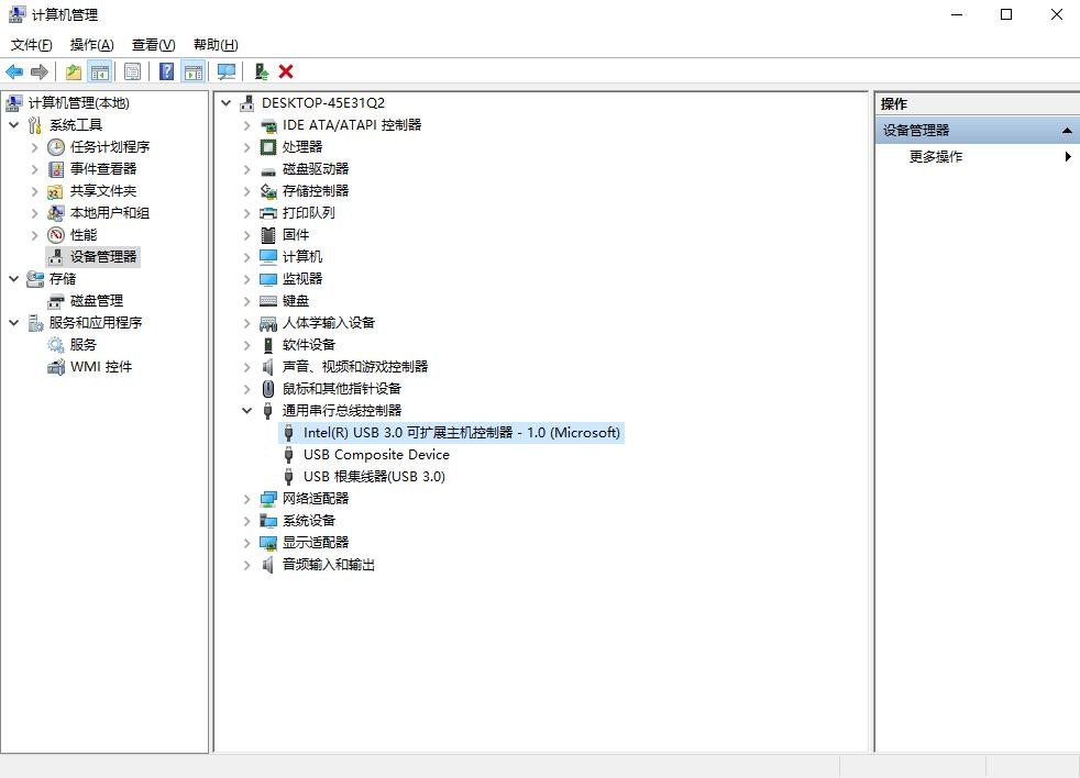 2、接下来我们打开计算器管理,找到设备管理器,然后找到通用串行总线控制器点开找到未知USB设备(描述设备符请求失败)的选项,找到症结所在,小编的电脑是没问题的所以没有那个选项,大家可以稍微参考一下。