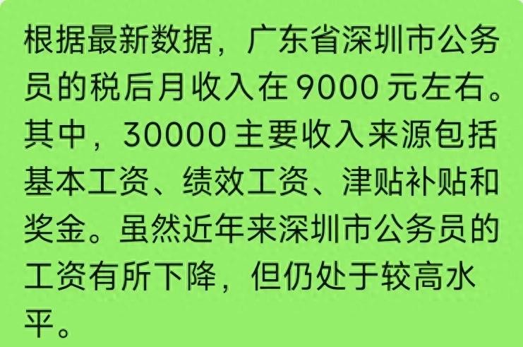 根据最新数据,广东省深圳市公务员的税后月收入大约在9000元左右。其中,主要的收入来源包括基本工资、绩效工资、津贴补贴和奖金,总额达到30000元。虽然近年来深圳市公务员的工资有所下降,但仍处于相对较高的水平。