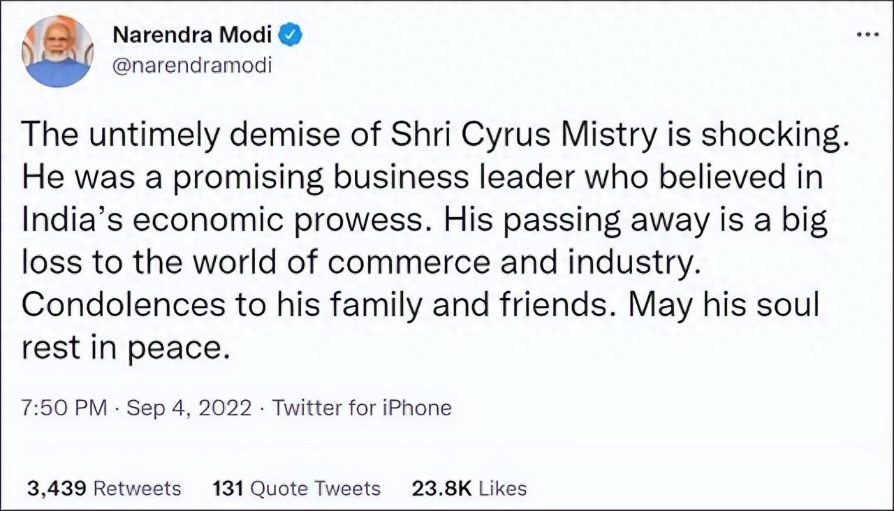 2022年9月4日晚,印度总理莫迪在社交网络上发文称:塔塔集团前董事长赛勒斯·米斯特里因车祸不幸去世,他的去世是印度商界的巨大损失,并对赛勒斯·米斯特里的家人表示慰问。