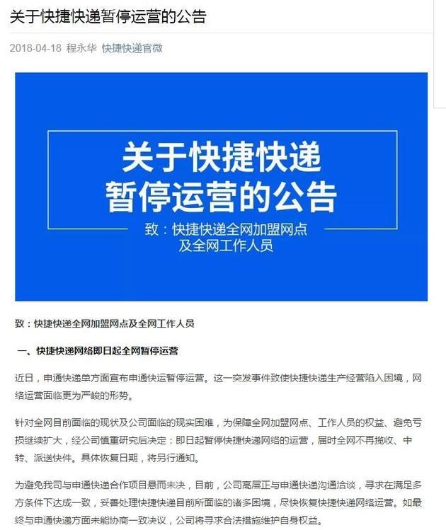 针对全网目前面临的现状及公司面临的现实困难,为保障全网加盟网点、工作人员的权益、避免亏损继续扩大,经公司慎重研究后决定:即日起暂停快捷快递网络的运营,届时全网不再揽收、中转、派送快件。具体恢复日期,将另行通知。