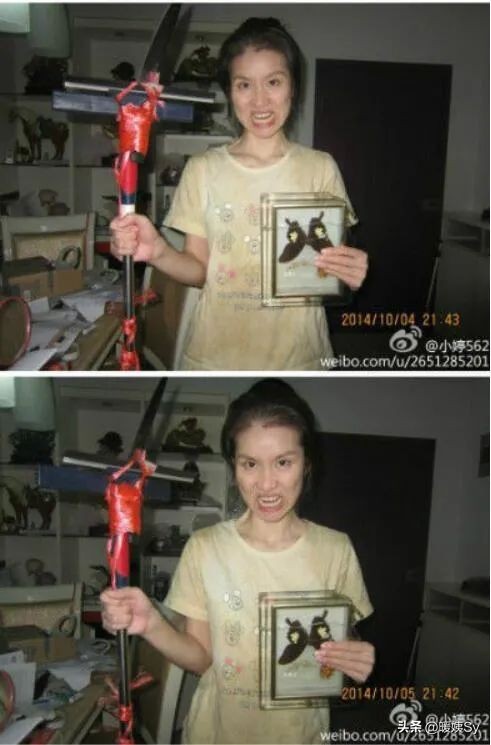 图片中,这位名叫小婷的姑娘,身穿黄色T恤,一手握着拖把和菜刀绑在一起的“关公大刀”,一手拿着相框边角破碎的蝴蝶图案照片。