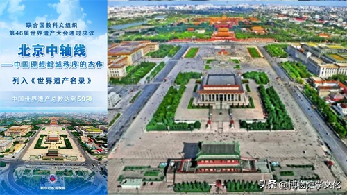 据新华社报道:当地时间2024年7月27日,在印度新德里召开的联合国教科文组织第46届世界遗产大会通过决议,将“北京中轴线——中国理想都城秩序的杰作”列入《世界遗产名录》。至此,中国世界遗产总数达到59项。“北京中轴线”纵贯北京老城南北,始建于13世纪,形成于16世纪,此后经不断演进发展,形成今天全长7.8公里、世界上最长的城市轴线。15个遗产构成要素为:钟鼓楼、万宁桥、景山、故宫、端门、天安门、外金水桥、太庙、社稷坛、天安门广场及建筑群(天安门广场、人民英雄纪念碑、毛主席纪念堂、国家博物馆和人民大会堂)、正阳门、南段道路遗存、天坛、先农坛、永定门。