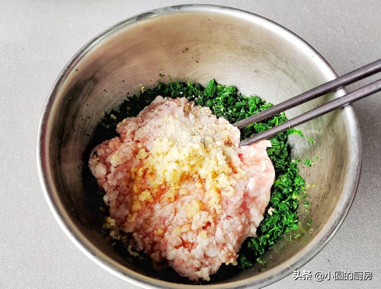 馅料:是肥七瘦的猪肉400克,焯过水的荠菜400克,盐小勺,胡椒粉适量,鸡粉少许,香油一大勺
