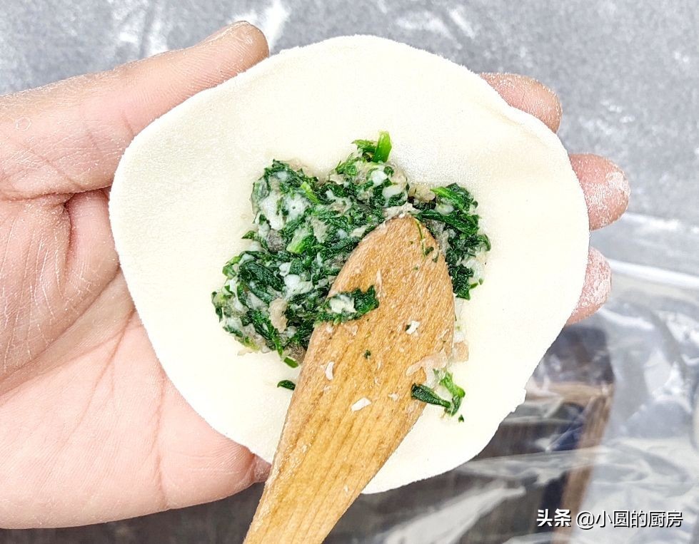 11、取上一张面皮,放上适量的馅料,包成自家喜欢的形状就可以了,小圆常做的一种,对叠成半圆状,两头交接就行
