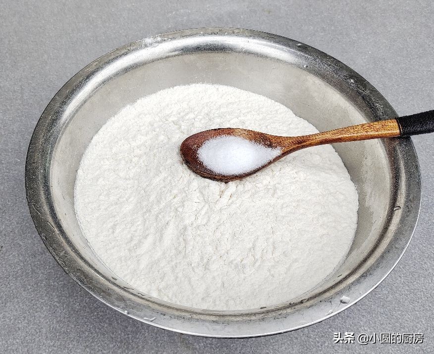 6、另外准备一个碗,把高筋面粉倒进去,再加入盐搅拌均匀,盐能增加面粉的筋性,口感会更加的劲道些