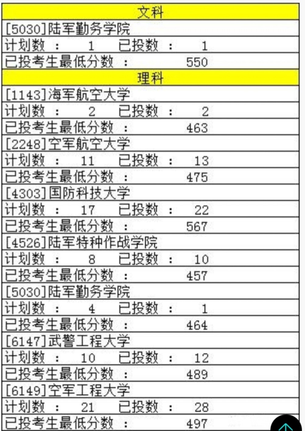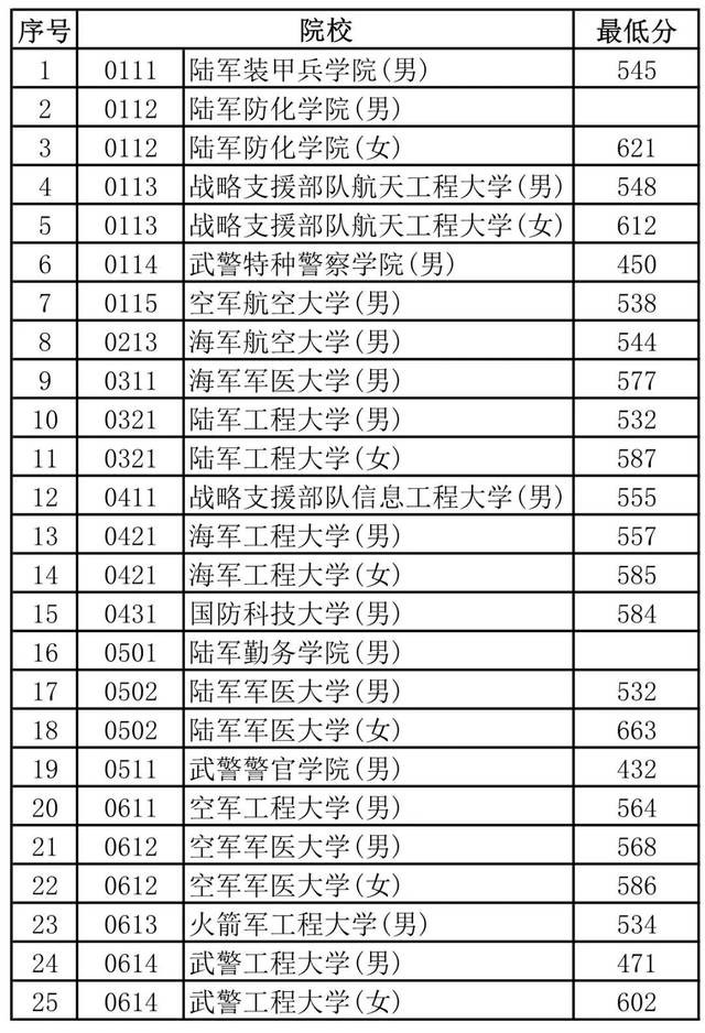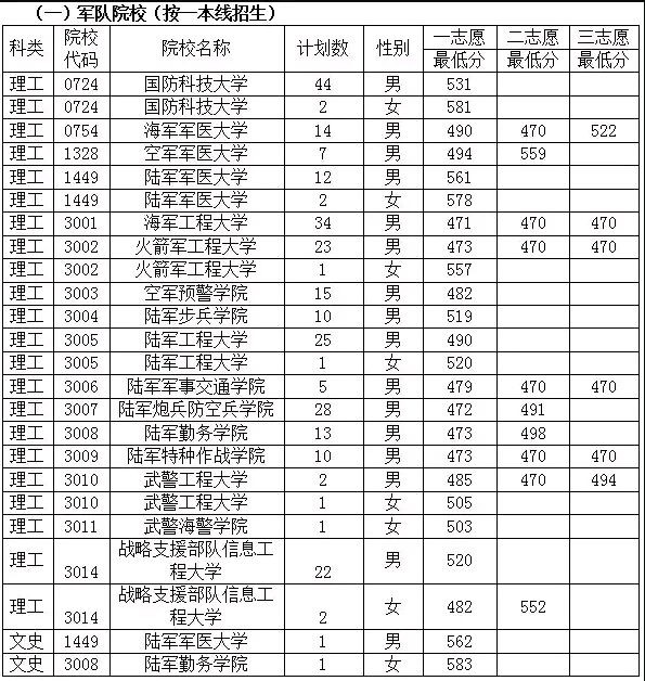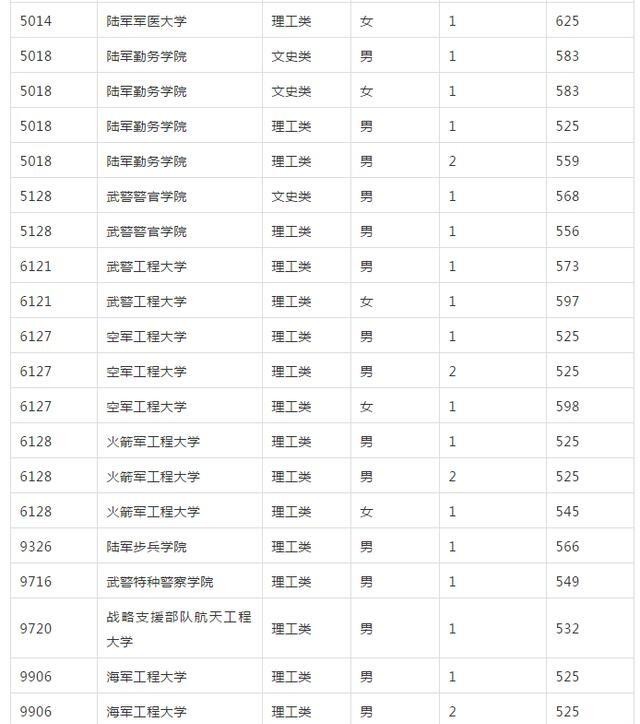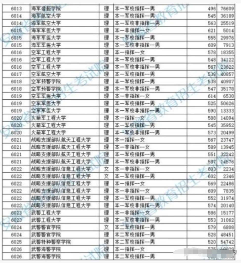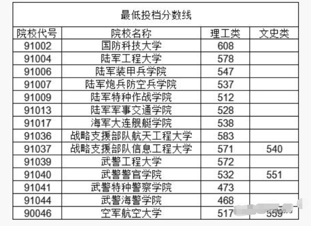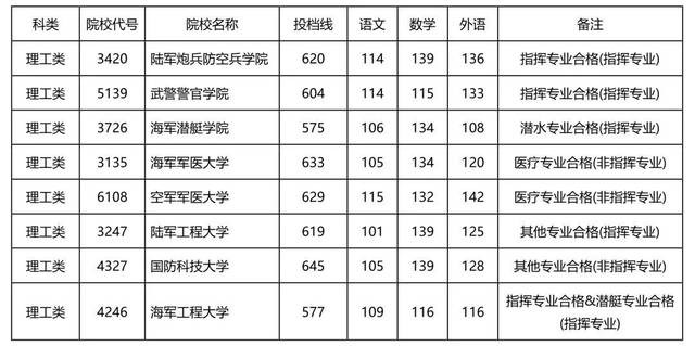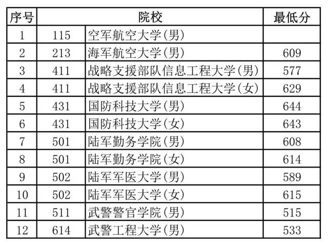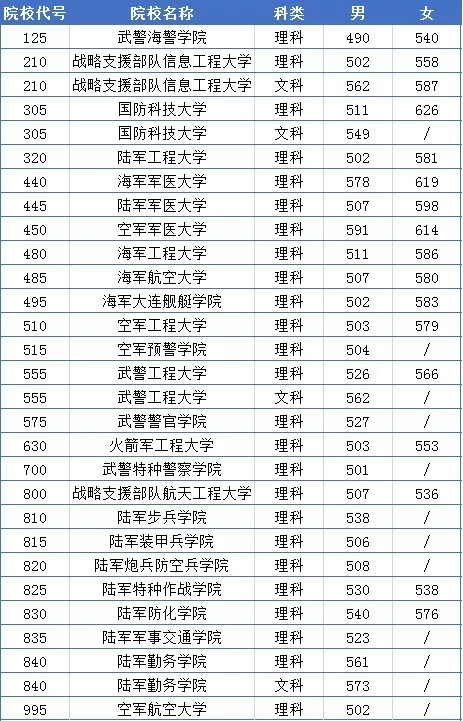安徽省的军检分数线相对来说也是比较高的。600分以上的有国防科技大学、陆军工程大学、海军军医大学。