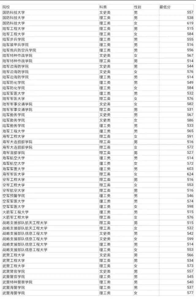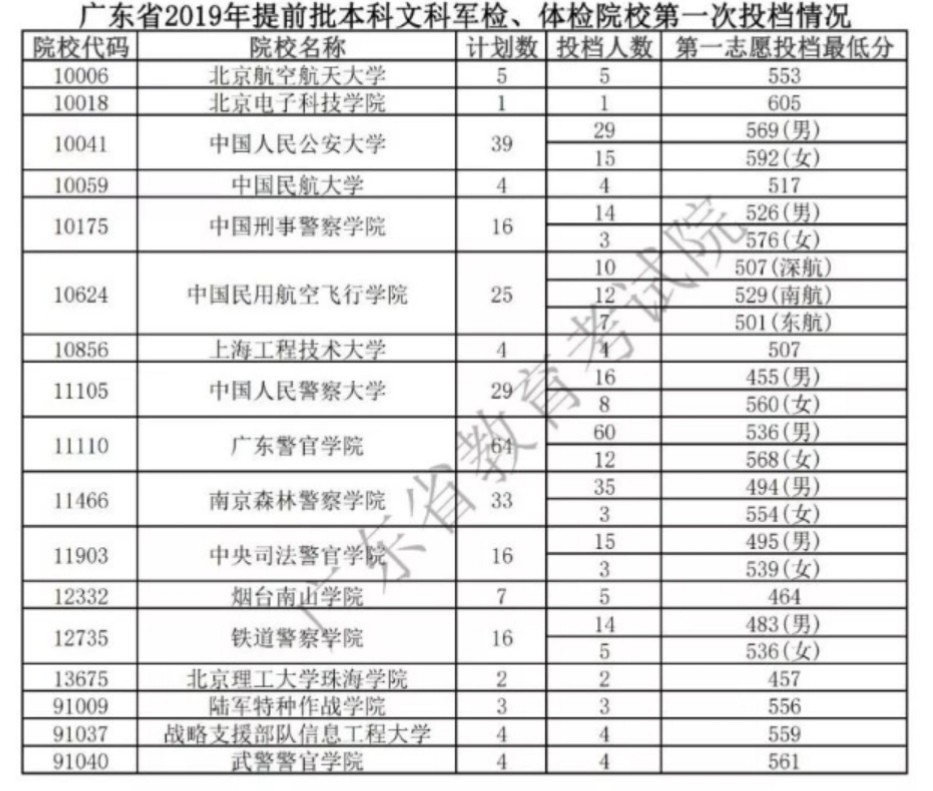 2019年军校在广东省的军检线是文理分来的,文科主要是公安类大学,理科类中军检分数较高的也是国防科技大学、海军军医大学、海军工程大学等