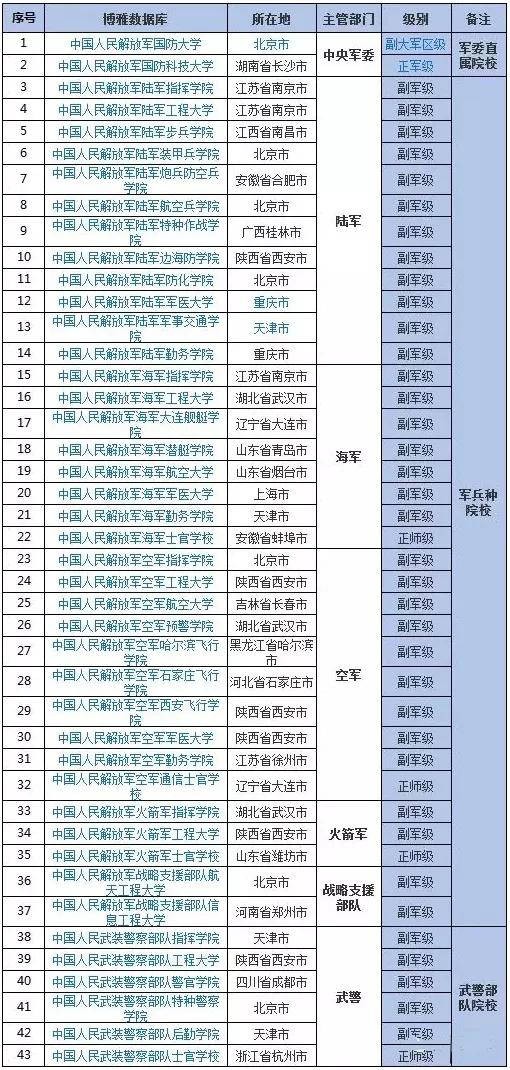 目前,我国军改后,有军校43所。其中陆军军校14所,海军军校8所,空军军校10所,火箭军军校3所,战略支援部队军校2所,武警部队军校6所。
