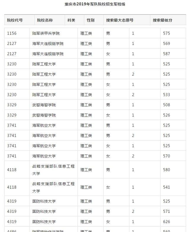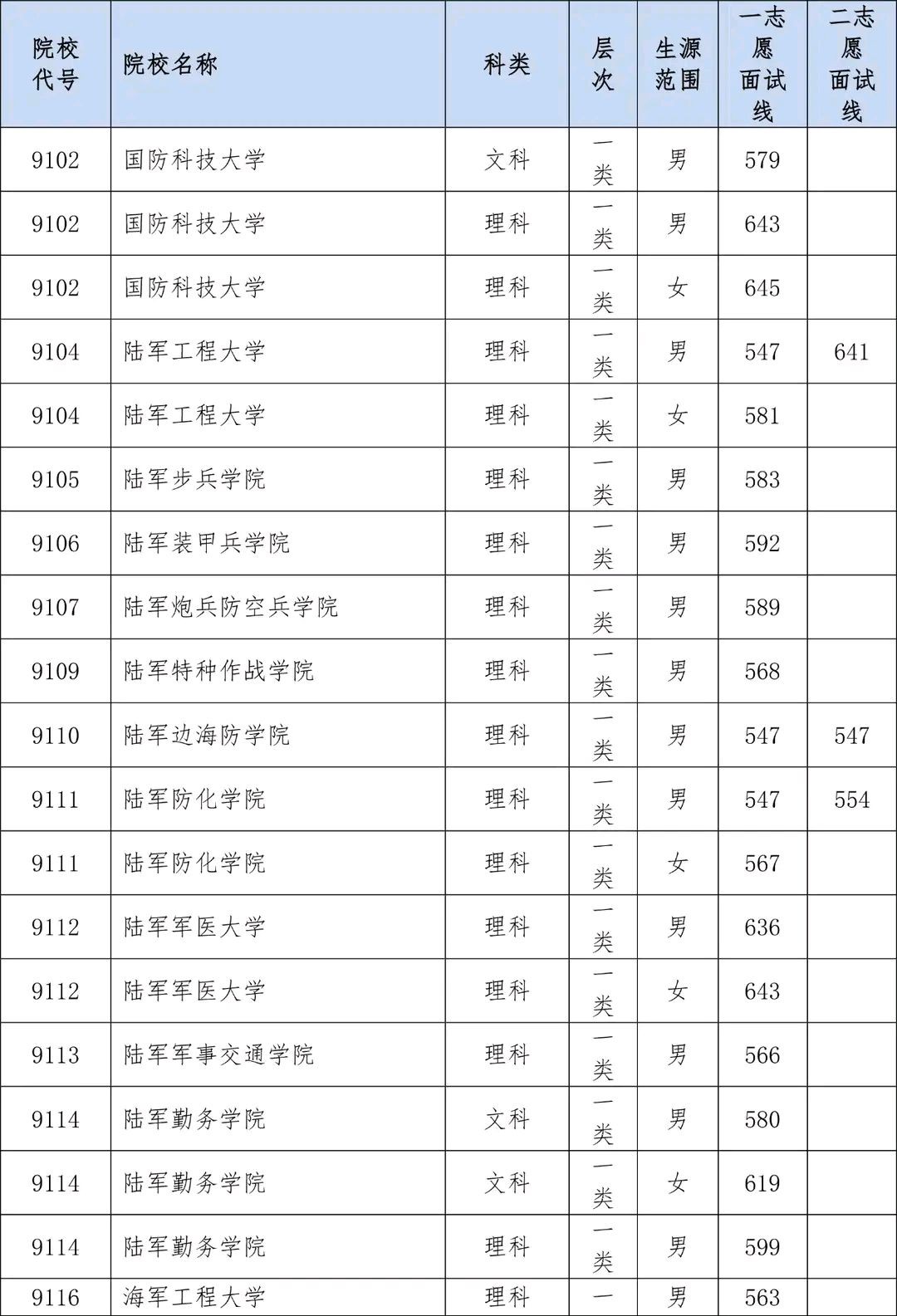 2019年四川省高分考生云集,因此各军校在四川的面试分数线也相对较高。国防科技大学理科男生面试分数线高达643分,女生高达643分。另外陆军军医大学、海军军医大学等军校面试分数线也比较高。