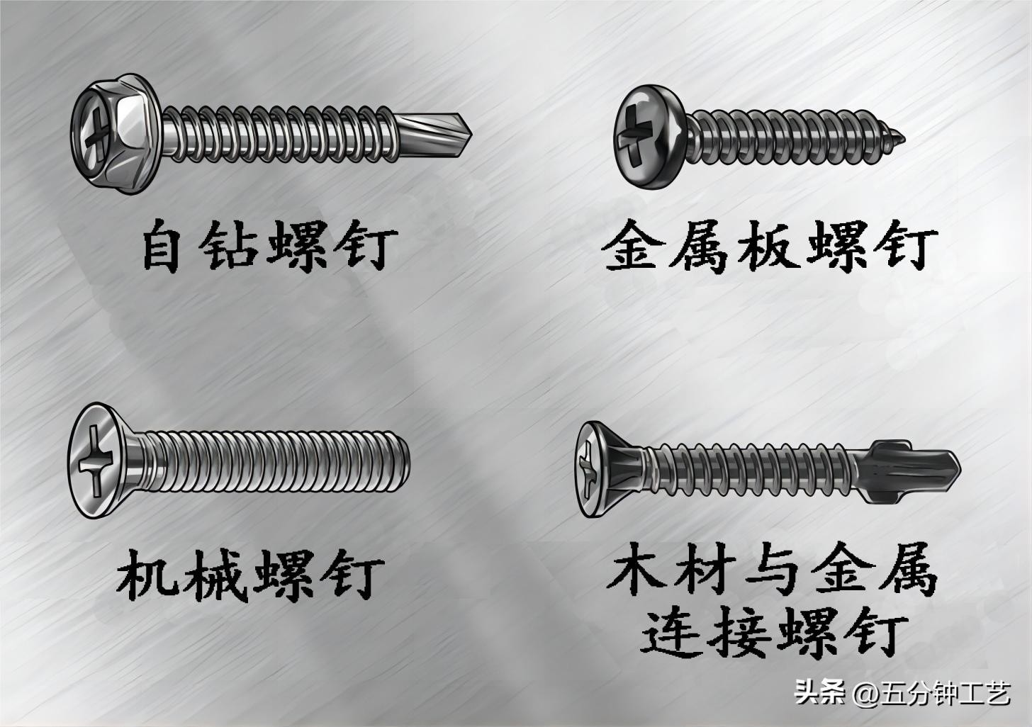 自钻螺钉:它们的尖端形状像钻头,能够轻易穿过金属,不需要拧钻导向孔。金属板螺钉:它们的尺寸通常较小,并且具有锋利的尖端,可以轻松进入金属表面。机械螺钉:平头且较小,非常坚固。通常用于固定机械和金属零件,另外电子设备中也常会用到。木材与金属连接螺钉:这种螺钉可以很好地将木材与金属固定在一起。螺钉在钻孔时会用前端的翼将木材铰出缝隙,一旦钻头钻到金属部件时,这个翼就会折断。
