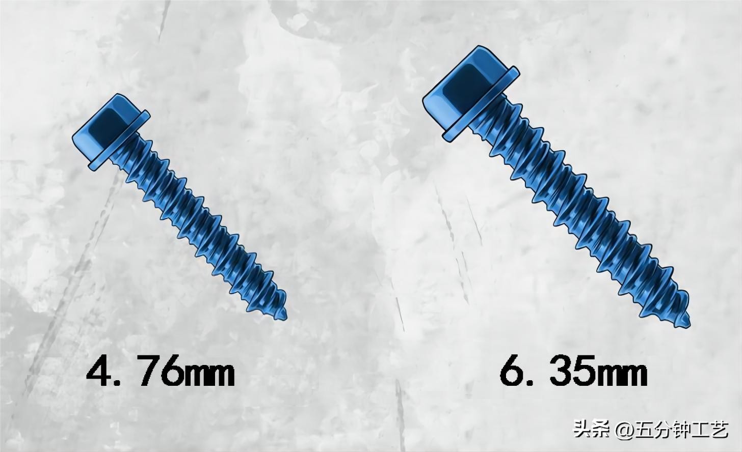 混凝土螺钉通常为蓝色,有 2种直径:4.76mm和6.35mm。4.76mm的螺钉,基本上就能满足大多数钻孔需求;但如果混凝土非常硬的话,可能就需要用6.35mm这种了。如果螺钉旋转到位仍没有夹紧混凝土,则有可能是安装螺钉的材料太软。这时候,最好是使用较长的6.35mm螺钉。混凝土螺钉通常带有六角头或十字平头。使用六角螺钉时,拧紧更容易;使用十字头螺钉时可使平头与表面保持齐平。