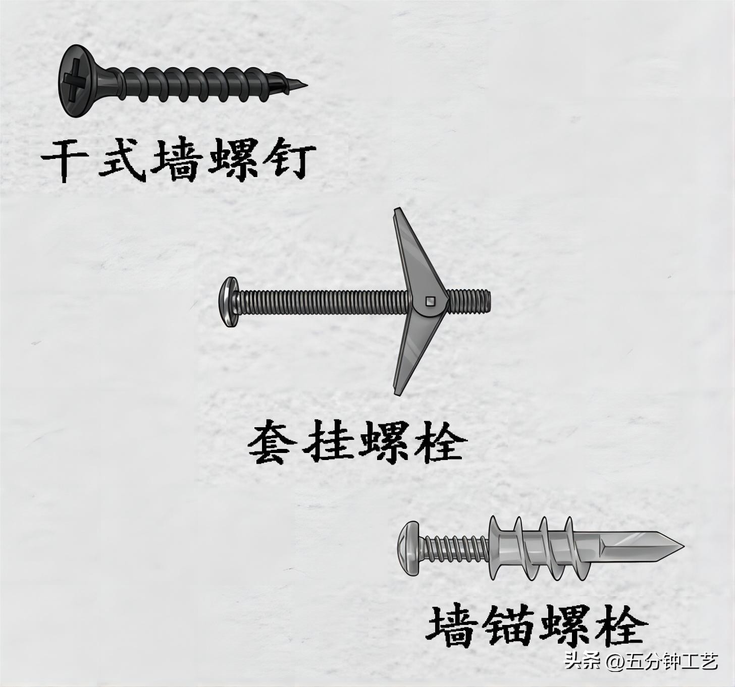 干式墙螺钉:它的自钻尖端很锋利,螺纹较深长度也足够,能有效防止钻孔处松动。既可以用于石膏板连接也可用于墙面连接。套挂螺栓:在穿过干墙钻孔以悬挂物品的情况下 ,最好使用套挂螺栓,但是所挂物品不能超过其最大承重量。墙锚螺栓:一般用作干墙或空心墙(如石膏板)上悬挂物体的紧固件。