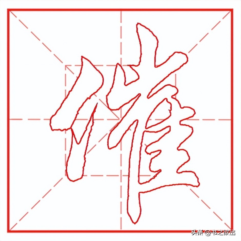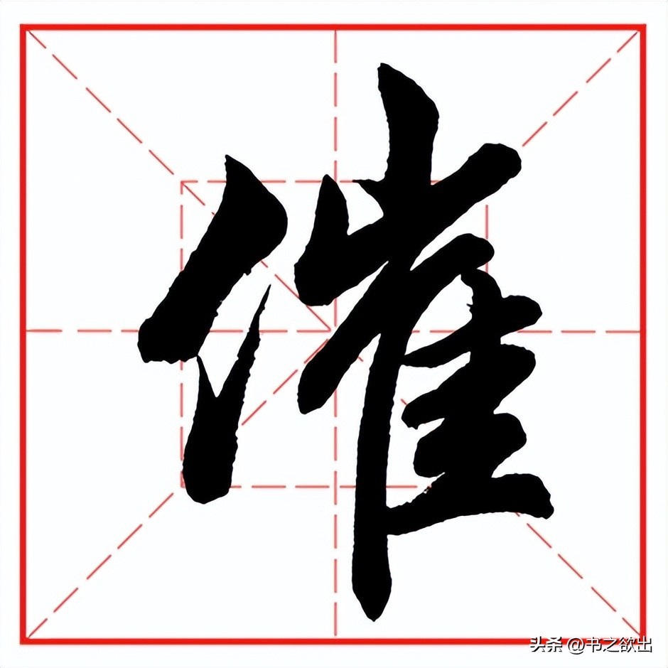 左边“单人旁”勿宽,撇笔稍重,以右点的笔法落笔,然后转锋向左下行,撇身稍直,收笔力达撇尖,不可一笔甩出;竖笔与撇画虚接起笔,位置靠下,竖身稍细,稍左斜,收笔垂露,不可悬针。