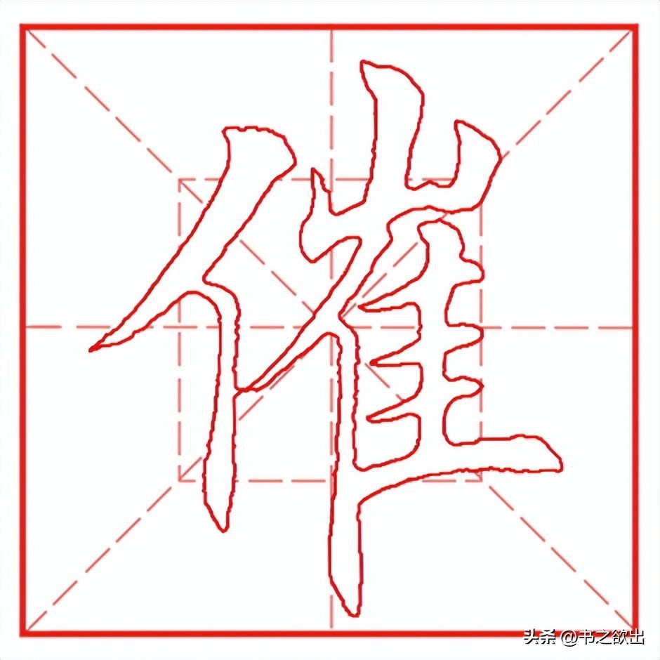右部“崔”字中竖高起,向下行笔略轻,稍左斜;竖折竖笔勿长,行笔到位后笔锋稍往左带然后顿笔向右抗肩上行,挡住竖画的收笔;右竖起笔稍高,笔势内收,略带撇意;“隹”字撇画勿重,角度稍立;竖笔与撇画虚接,竖身稍细,略左斜,收笔垂露;右边竖点起笔与撇画平齐,略带撇意;三个横画露锋轻入,抗肩圆收,平行等距,右部勿长;竖笔贯穿诸横,垂直有力;最后底横从左竖里面实接起笔,与上面三个横画间距相等,收笔稍下压,稳住整字。