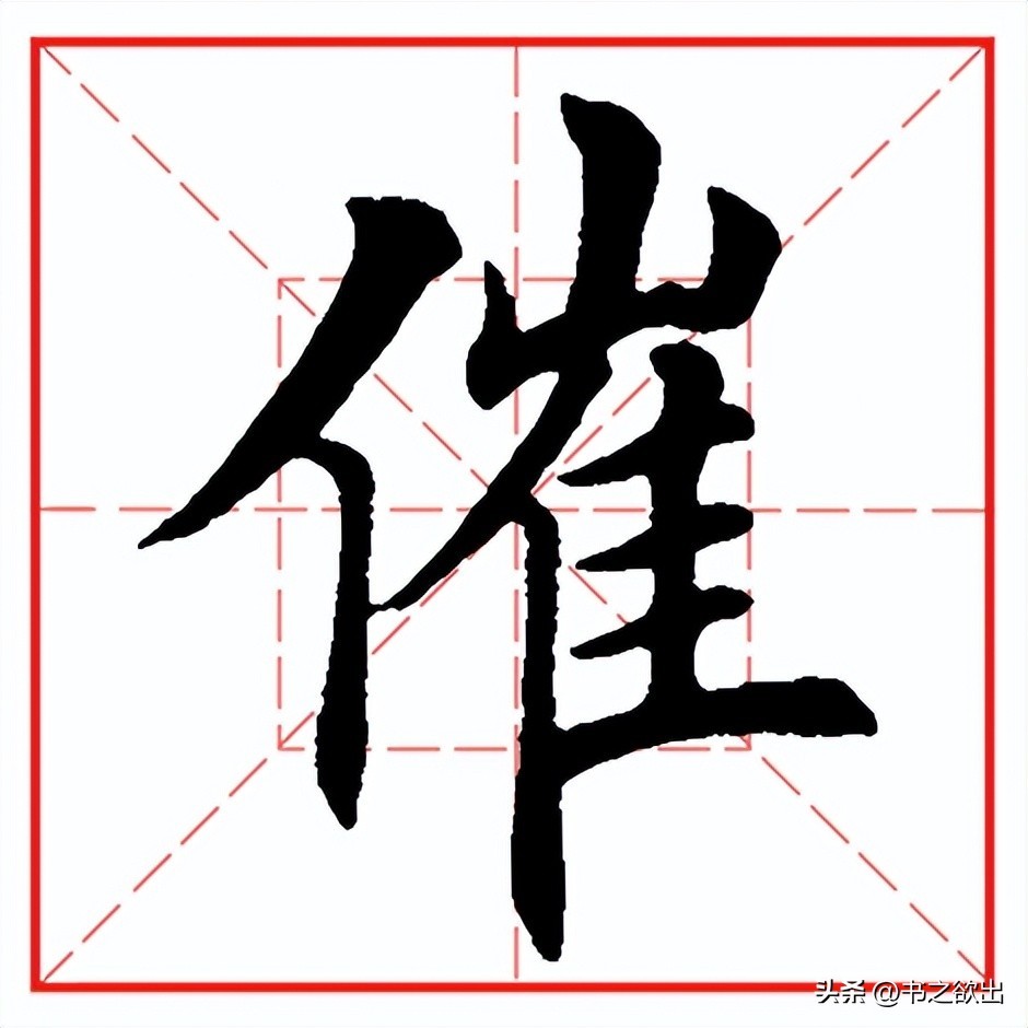 催,拼音cuī,《说文解字》中注:“催,相俦也。从人、崔声。 ”。大高山是崔之范式,人、崔两范式叠加,表示逼迫于人,本义即为催促、促使。