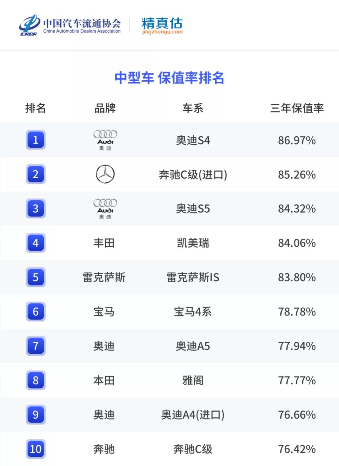 中级轿车领域,保值率前三车型为奥迪S4、进口奔驰C级、奥迪S5,3年保值率分别为86.97%、85.26%和84.32%。日系在中级轿车方面就显得后劲不足了,仅凯美瑞和雅阁出现在榜单中,保值率分别为84.06%和77.77%。自主品牌由于轿车车型太少,技术和产品都不足,保值率也并不高,只有红旗H5超过60%。