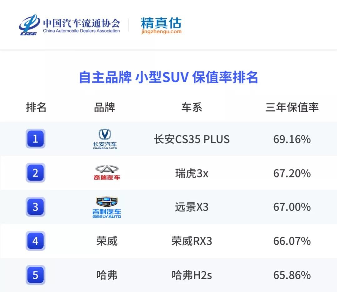 已经退出中国的铃木汽车,依旧是“小车之王”,那款只能进口的小型越野车吉姆尼,竟然是小型SUV保值率第一,3年保值率可达到76.46%。本田XR-V和丰田奕泽排名二三,保值率为73.72%和72.97%,丰田C-HR为72.35%。小型SUV有三款自主SUV出现在榜单中,包括长安CS35 PLUS、奇瑞瑞虎3x、吉利远景X3,保值率维持在60%以上。