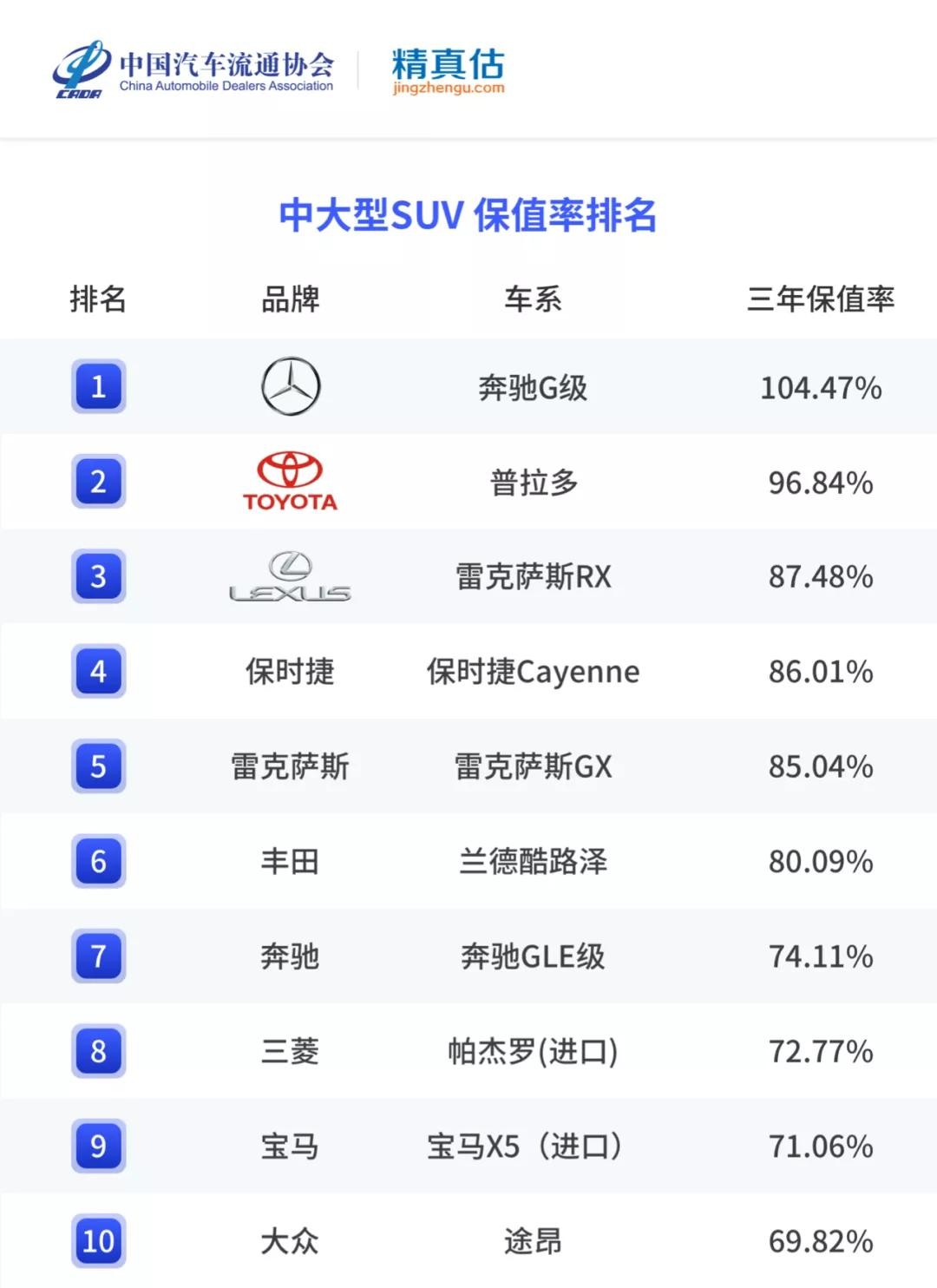 什么样的车可以当理财产品用?答案是大型SUV,由于有不少的产品溢价,丰田普拉多、雷克萨斯RX、兰德酷路泽、奔驰G级等车型保值率不降反升,比如奔驰G级三年保值率为104.47%,普拉多为96.84%。