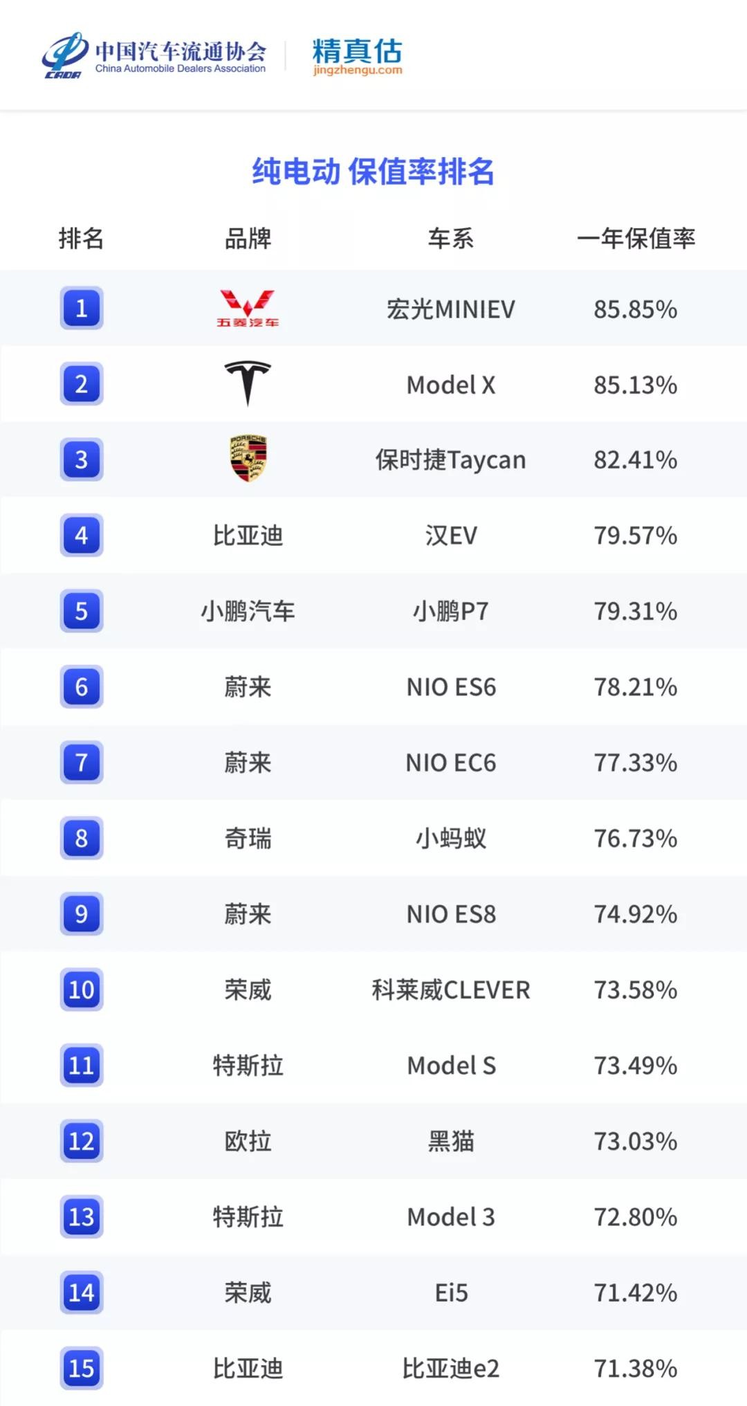 纯电动汽车一年保值率排名中,五菱宏光MINI EV以85.85%的保值率超越特斯拉Model X,位居榜首,排名第三的是保时捷taycan,一年保值率为82.41%;一年保值率排名4-10位的分别是比亚迪汉EV、小鹏P7、蔚来ES6、蔚来EC6、奇瑞小蚂蚁、荣威科来威。值得一提的是,在中国电动汽车市场销量排名前三的特斯拉Model 3一年保值率仅为72.8%,排名第12位。