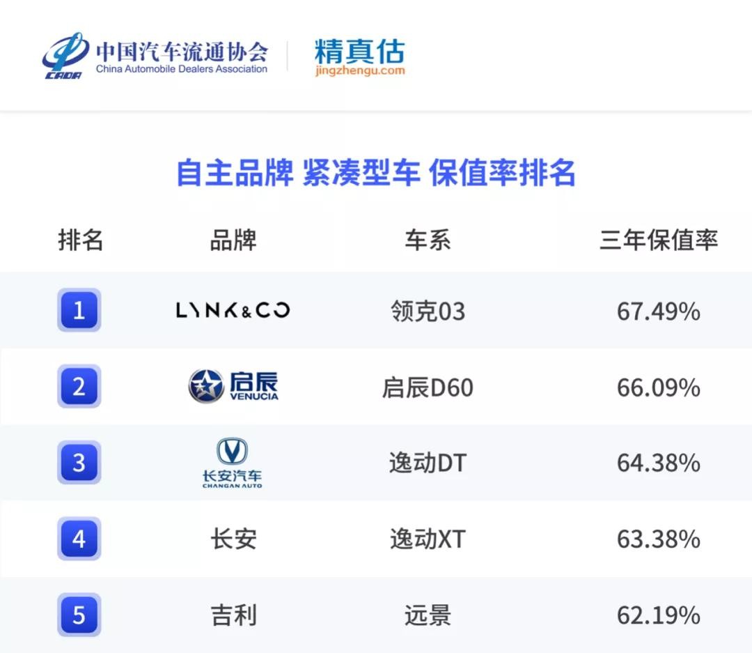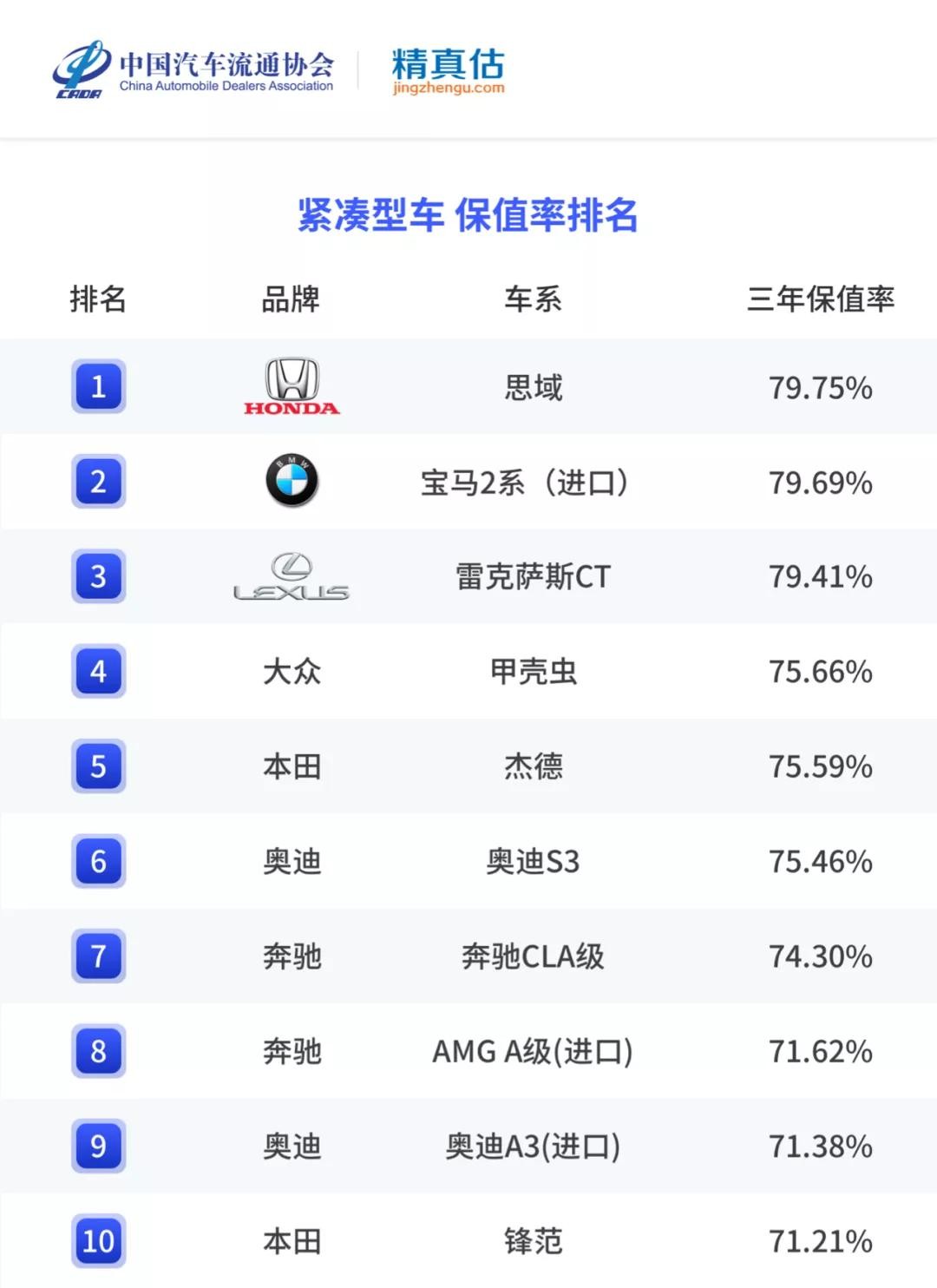 紧凑型车中,东风本田思域、杰德、广汽本田锋范、一汽丰田卡罗拉、东风日产骐达保值率相对较高,其中思域三年保值率高达79.75%,但进口的宝马2系和雷克萨斯CT保值率同样在79%以上,这点让人感到很惊喜。在自主紧凑型中,领克03的保值率为67.49%。